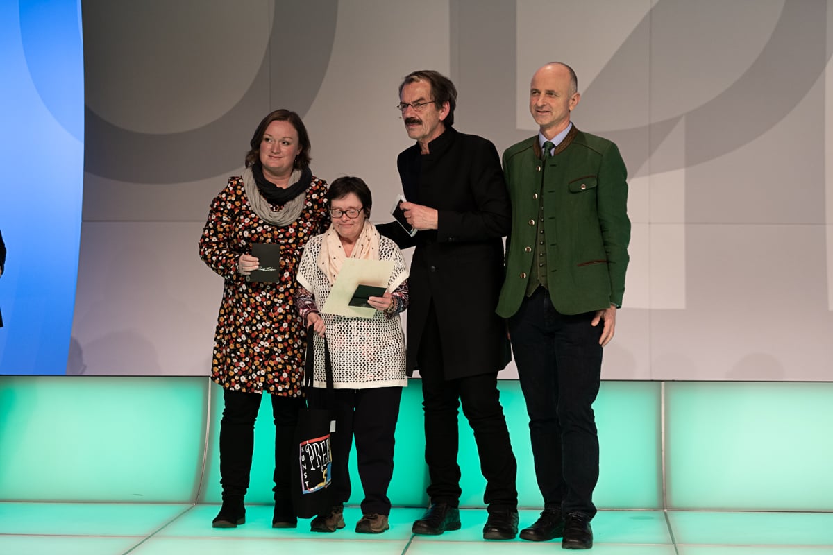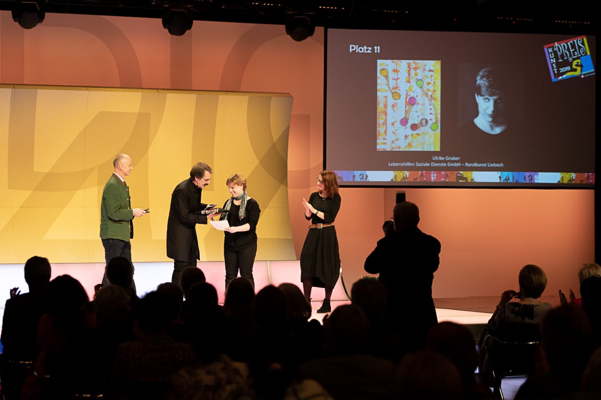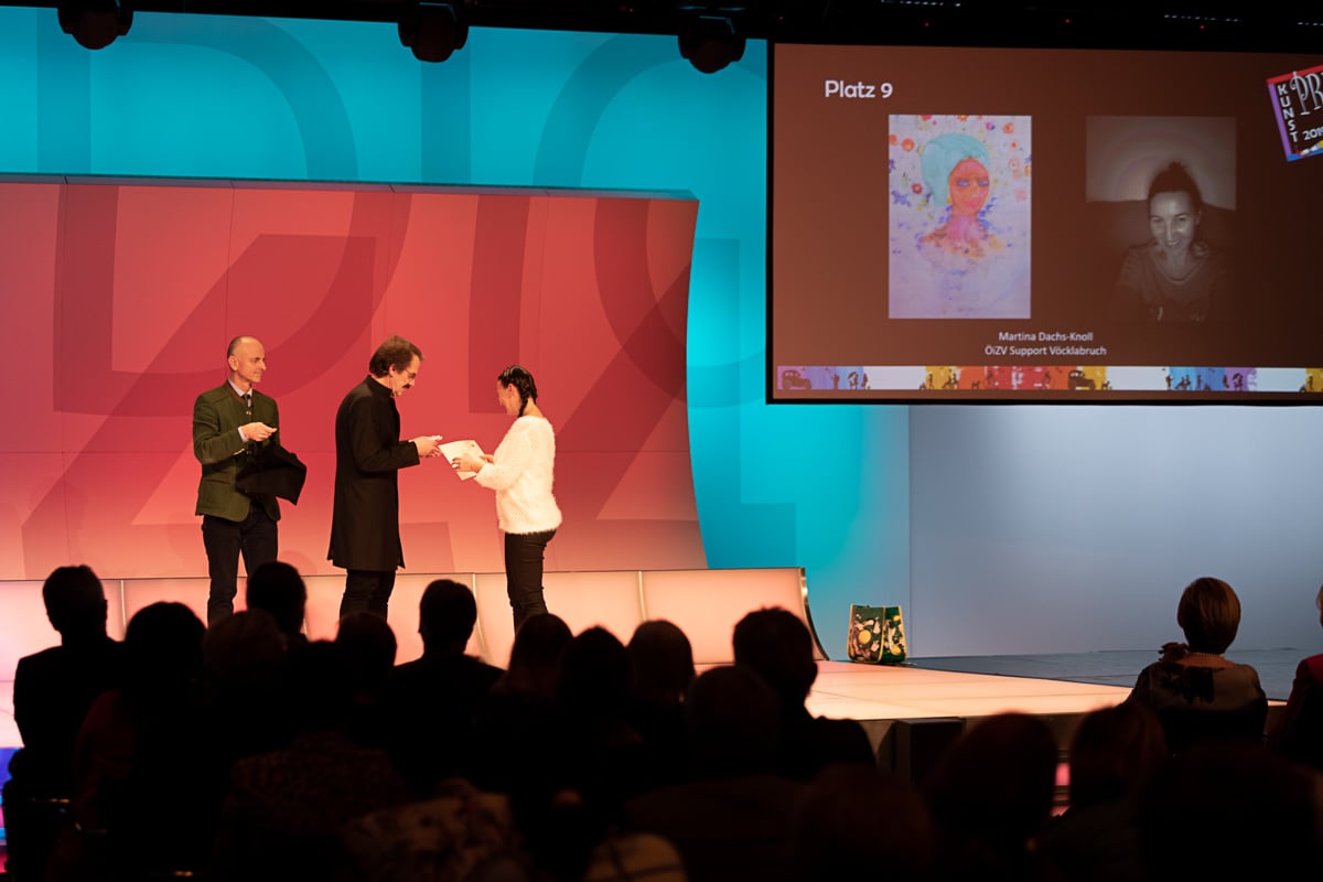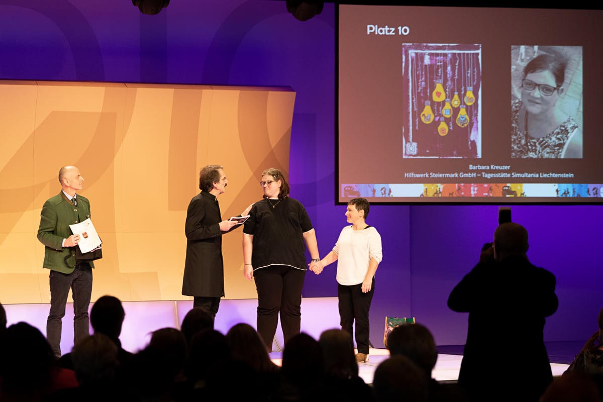 Platz 2 ging an Marianne Kloibhofer von der Lebenshilfe Oberösterreich – Malatelier Tagesheimstätte Grein. Die 700 Euro Preisgeld der Hilfswerk Steiermark GmbH wurden von Reinhard Kollmann, dem organisatorischen Leiter der Tagesstätte Simultania Liechtenstein, überreicht.