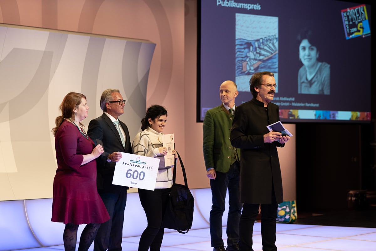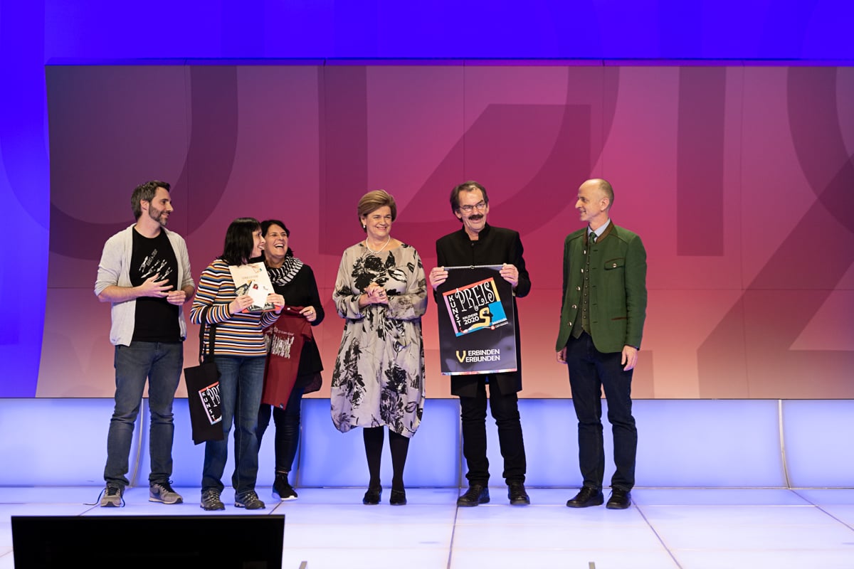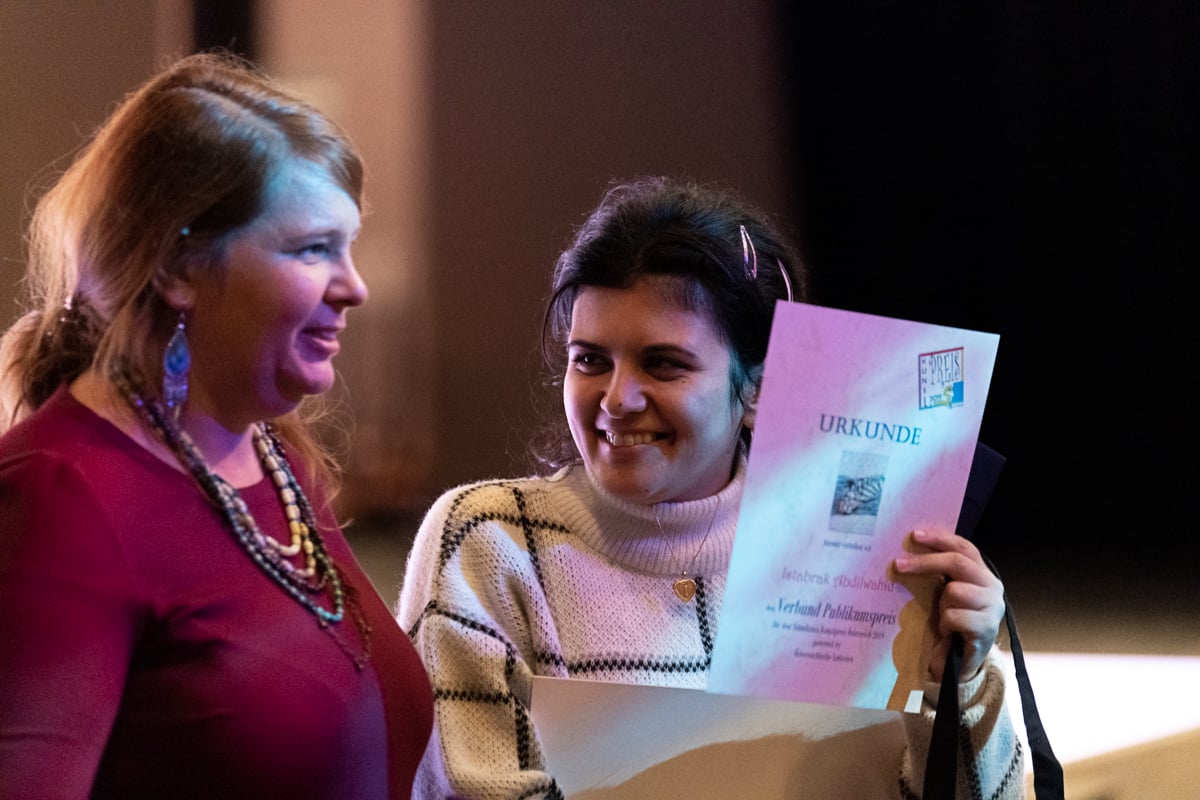 Und da gab es heuer eine Neuheit, eine Besonderheit: Da das Thema ja „Verbinden – Verbunden“ lautet, und der Steirische Verkehrsverbund, der „Verbund Linie“, heuer sein 25-jähriges Jubiläum feiert, wurde das online-Voting kurzerhand zum „Verbundpreis“ aufgewertet. Der Steirische Verkehrsverbund wählte 15 Kunstwerke aus allen Bildern des online-Votings und stellte sie in einem eigens umgebauten Galerie-Bus aus. Diese Bilder illustrieren weiters die Fahrpläne der Verbund Linie für das Jahr 2020. Und die Siegerin des online-Votings, Istabrak Abdilwahid (Lebenshilfen Soziale Dienste GmbH – Malatelier Randkunst) erhielt neben dem Dezember-Blatt im Simultania Kunstkalender ein Preisgeld in Höhe von 600 Euro von Verkehrsverbund-Chef DI Dr. Peter Gspaltl.